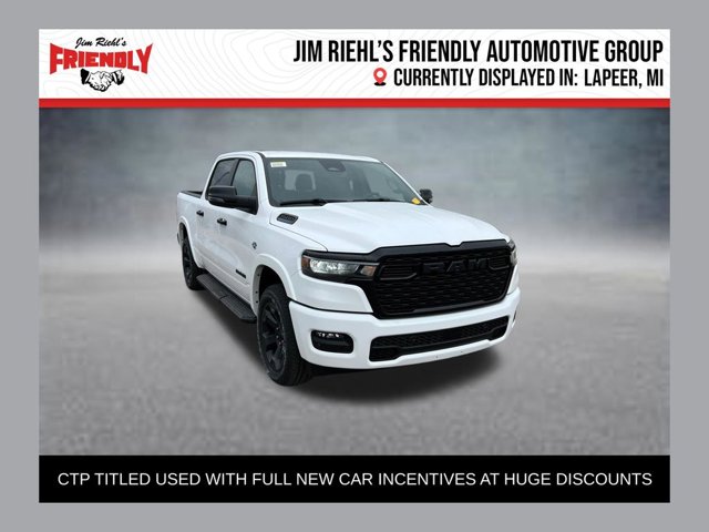 CTP Courtesy Transportation Program Titled used with full new car incentives at huge discounts. This Vehicle is currently located in Lapeer. Welcome to Jim Riehl's Friendly Chrysler Dodge Jeep Ram of Lapeer. Just North of FCA Headquarters on Lapeer Road South of I69. We are delivering vehicles Daily. To your home or office. Please call us today 810.664.2900. Sale Prices are based on incentives available in Lapeer County. Residency restrictions apply. Sale price includes Stellantis loyalty, or conquest offers when applicable to Stellantis offers.2026 Ram 1500 Big Horn/Lone StarBright White Clearcoat8-Speed AutomaticHEMI 5.7L V8 Multi Displacement VVT eTorque4WD$12,485 off MSRP!Deluxe Cloth Bucket Seat, Heated Front Seats, Radio: Uconnect 5 Navigation with 12.0 Display, Wheels: 20 x 9.0 Aluminum Painted Clad.https://www.kbb.com/kbbreport/2rhhp Descriptions and discounts are compiled automatically with human assistance. Errors can occur. Please verify all equipment with manufacturer monroney label prior to making a purchase decision. FCA Employee Price and/or Lease offer includes: $2000 - 2026 National SFS Lease Loyalty Bonus Cash . Exp. 04/30/2026 $3500 - 2026 National Retail Bonus Cash . Exp. 04/30/2026