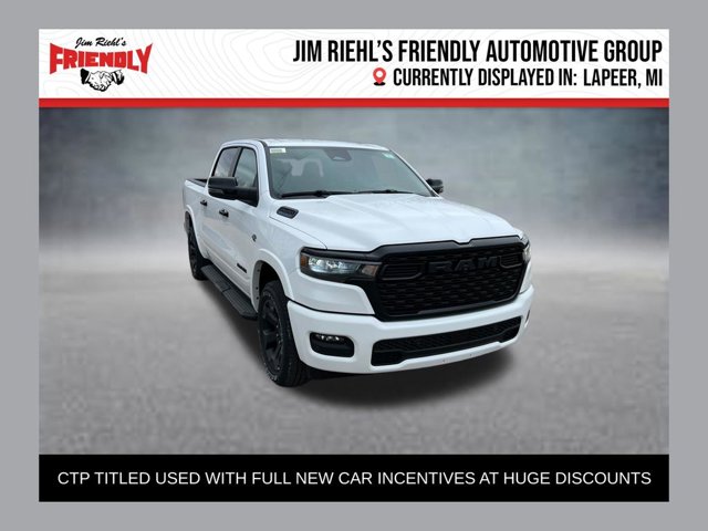 CTP Courtesy Transportation Program Titled used with full new car incentives at huge discounts. This Vehicle is currently located in Lapeer. Welcome to Jim Riehl's Friendly Chrysler Dodge Jeep Ram of Lapeer. Just North of FCA Headquarters on Lapeer Road South of I69. We are delivering vehicles Daily. To your home or office. Please call us today 810.664.2900. Sale Prices are based on incentives available in Lapeer County. Residency restrictions apply. Sale price includes Stellantis loyalty, or conquest offers when applicable to Stellantis offers.2026 Ram 1500 Big Horn/Lone StarBright White Clearcoat8-Speed AutomaticHEMI 5.7L V8 Multi Displacement VVT eTorque4WD$13,485 off MSRP!Deluxe Cloth Bucket Seats, Heated Front Seats, Radio: Uconnect 5 Navigation with 12.0 Display, Wheels: 20 x 9.0 Aluminum Painted Clad.https://www.kbb.com/kbbreport/j9vy1 Descriptions and discounts are compiled automatically with human assistance. Errors can occur. Please verify all equipment with manufacturer monroney label prior to making a purchase decision. FCA Employee Price and/or Lease offer includes: $2000 - 2026 National SFS Lease Loyalty Bonus Cash . Exp. 04/30/2026 $3500 - 2026 National Retail Bonus Cash . Exp. 04/30/2026