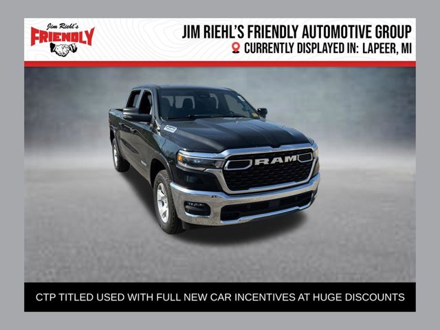 CTP Courtesy Transportation Program Titled used with full new car incentives at huge discounts. This Vehicle is currently located in Lapeer. Welcome to Jim Riehl's Friendly Chrysler Dodge Jeep Ram of Lapeer. Just North of FCA Headquarters on Lapeer Road South of I69. We are delivering vehicles Daily. To your home or office. Please call us today 810.664.2900. Sale Prices are based on incentives available in Lapeer County. Residency restrictions apply. Sale price includes Stellantis loyalty, or conquest offers when applicable to Stellantis offers.2026 Ram 1500 Big Horn/Lone StarDiamond Black Crystal Pearlcoat8-Speed Automatic3.0L I64WD$11,896 off MSRP!Deluxe Cloth Bucket Seats, Heated Front Seats, Radio: Uconnect 5 W with 8.4 Display, Wheels: 18 x 8 Cast-Aluminum Painted.https://www.kbb.com/kbbreport/ad4ly Descriptions and discounts are compiled automatically with human assistance. Errors can occur. Please verify all equipment with manufacturer monroney label prior to making a purchase decision. FCA Employee Price and/or Lease offer includes: $2000 - 2026 National SFS Lease Loyalty Bonus Cash . Exp. 04/30/2026 $3500 - 2026 National Retail Bonus Cash . Exp. 04/30/2026