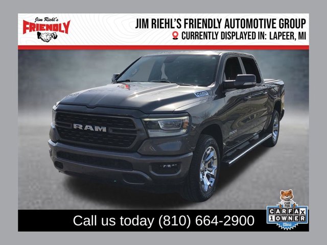 This Vehicle is currently located in Lapeer. Welcome to Jim Riehl's Friendly Chrysler Dodge Jeep Ram of Lapeer. Just North of FCA Headquarters on Lapeer Road South of I69. We are delivering vehicles Daily. To your home or office. Please call us today 810.664.2900. Sale Prices are based on incentives available in Lapeer County. Residency restrictions apply. Sale price includes Stellantis loyalty, or conquest offers when applicable to Stellantis offers.2022 Ram 1500 Big Horn/Lone Star Granite Crystal Metallic Clearcoat 3.6L V6 24V VVT 8-Speed Automatic 4WDCARFAX One-Owner. Clean CARFAX. Priced below KBB Fair Purchase Price! Odometer is 536 miles below market average! 115V Auxiliary Power Outlet, 115V Auxiliary Rear Power Outlet, 2nd Row In Floor Storage Bins, 9 Amplified Speakers w/Subwoofer, Air Conditioning ATC w/Dual Zone Control, All Plant-Installed Decals, Auto-Dimming Exterior Driver Mirror, Auto-Dimming Rear-View Mirror, Big Horn Badge, Big Horn Level 2 Equipment Group, Black Exterior Mirrors, Black Interior Accents, Black Premium Power Mirrors, Bluetooth Handsfree Phone & Audio, Body Color Exterior Mirrors, Body Color Front Bumper, Body Color Premium Power Mirrors, Body Color Rear Bumper w/Step Pads, Bridgestone Brand Tires, Class IV Receiver Hitch, Cluster 7.0 TFT Color Display, Convex Wide-Angle Mirror Insert, Delay-off headlights, Deluxe Cloth Bucket Seats, Dome Dual LED Reading Lamp, Dual-Pane Panoramic Sunroof, Exterior Mirrors Courtesy Lamps, Exterior Mirrors w/Heating Element, Exterior Mirrors w/Supplemental Signals, Front fog lights, Front LED Fog Lamps, Fully automatic headlights, Glove Box Lamp, Heated door mirrors, Heated Front Seats, Heated Steering Wheel, Illuminated entry, LED Reflector Headlamps, LED Taillamps, Media Hub w/2 Charge Only USBs, Navigation System, Overhead LED Lamps, ParkSense Front/Rear Park Assist w/Stop, ParkView Rear Back-Up Camera, Power 2-Way Driver Lumbar Adjust, Power 8-Way Driver Seat, Power Adjustable Pedals, Power-Folding Mirrors, Premium Lighting Group, Premium Overhead Console, Quick Order Package 23Z Big Horn, Radio: Uconnect 5 W w/8.4 Display, Rear Dome w/On/Off Switch Lamp, Rear Power Sliding Window, Rear Window Defroster, Remote keyless entry, Remote Start System, Security Alarm, SiriusXM Satellite Radio, Split folding rear seat, Sport Appearance Package, Sport Decal, Sun Visors w/Illuminated Vanity Mirrors, Trailer Brake Control, Trailer Light Check, Trailer Reverse Steering Control, Trailer Tire Pressure Monitoring System, Trailer Tow Group, Universal Garage Door Opener, Wheels: 20 x 9 Aluminum Chrome Clad (WRK).Vehicle is eligible to be Chrysler Certified.https://www.kbb.com/kbbreport/57r44