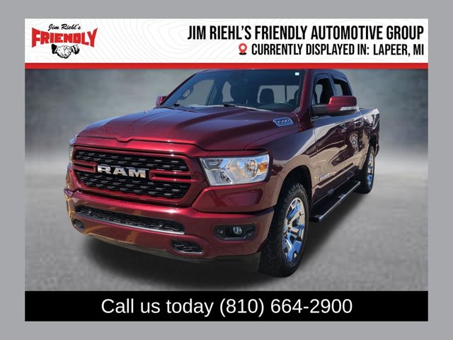 This Vehicle is currently located in Lapeer. Welcome to Jim Riehl's Friendly Chrysler Dodge Jeep Ram of Lapeer. Just North of FCA Headquarters on Lapeer Road South of I69. We are delivering vehicles Daily. To your home or office. Please call us today 810.664.2900. Sale Prices are based on incentives available in Lapeer County. Residency restrictions apply. Sale price includes Stellantis loyalty, or conquest offers when applicable to Stellantis offers.2022 Ram 1500 Big Horn/Lone Star Delmonico Red Pearlcoat HEMI 5.7L V8 Multi Displacement VVT 8-Speed Automatic 4WDClean CARFAX. 115V Auxiliary Power Outlet, 115V Auxiliary Rear Power Outlet, 2nd Row In Floor Storage Bins, Air Conditioning ATC w/Dual Zone Control, All Plant-Installed Decals, Auto-Dimming Exterior Driver Mirror, Auto-Dimming Rear-View Mirror, Big Horn Badge, Big Horn Level 2 Equipment Group, Black Exterior Mirrors, Black Interior Accents, Black Premium Power Mirrors, Bluetooth Handsfree Phone & Audio, Body Color Exterior Mirrors, Body Color Front Bumper, Body Color Premium Power Mirrors, Body Color Rear Bumper w/Step Pads, Bridgestone Brand Tires, Class IV Receiver Hitch, Cluster 7.0 TFT Color Display, Convex Wide-Angle Mirror Insert, Delay-off headlights, Deluxe Cloth Bucket Seats, Exterior Mirrors Courtesy Lamps, Exterior Mirrors w/Heating Element, Exterior Mirrors w/Supplemental Signals, Fully automatic headlights, Glove Box Lamp, Heated door mirrors, Heated Front Seats, Heated Steering Wheel, Media Hub w/2 Charge Only USBs, ParkSense Front/Rear Park Assist w/Stop, ParkView Rear Back-Up Camera, Power 2-Way Driver Lumbar Adjust, Power 8-Way Driver Seat, Power Adjustable Pedals, Power-Folding Mirrors, Quick Order Package 27Z Big Horn, Radio: Uconnect 5 W w/8.4 Display, Rear Dome w/On/Off Switch Lamp, Rear Power Sliding Window, Rear Window Defroster, Remote Start System, Security Alarm, SiriusXM Satellite Radio, Sport Appearance Package, Sport Decal, Sun Visors w/Illuminated Vanity Mirrors, Universal Garage Door Opener.https://www.kbb.com/kbbreport/dm9yy
